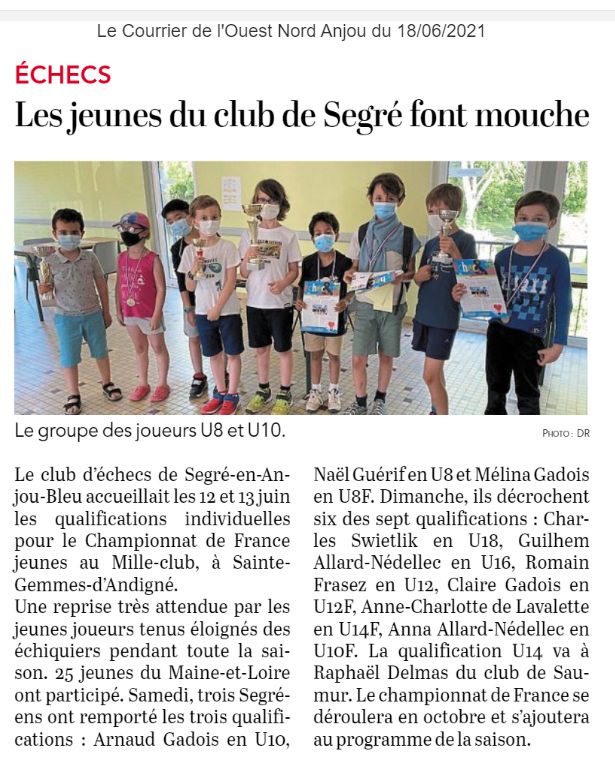 Dimanche, les Segréens continuent avec 6 qualifications sur 7 : Charles Swietlik en U18, Guilhem Allard-Nédellec en U16, Romain Frasez en U12, Claire Gadois en U12F, Anne-Charlotte de Lavalette en U14F, Allard-Nédellec en U10F.